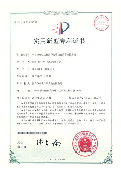 眾所周知,市政排水系統一般設置于城市道路、橋梁表面較低處,由于常規柵格式市政排水篦柵格較大,落葉及其它城市垃圾在風吹、環衛灑水、清掃及雨水天氣路面雨水攜帶等多種情況下易于進入排水系統,導致排水系統堵塞失效或排水井底部垃圾積聚,進而發酵、散發惡臭,嚴重影響城市形象?;诖耍夜狙邪l了“一種帶有垃圾收納和防堵功能的市政排水篦”,近日獲得國家知識產權局頒發的國家實用新型專利證書。