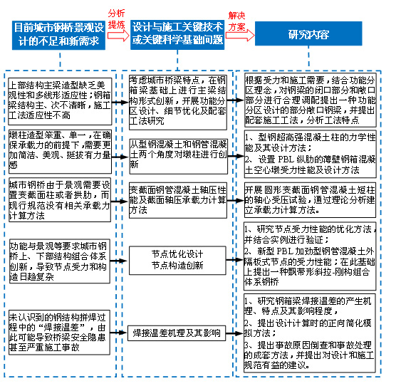 城市橋梁建設(shè)受到地形、管線、既有交通、城市規(guī)劃方案等諸多限制,其景觀設(shè)計往往和橋梁結(jié)構(gòu)的創(chuàng)新、優(yōu)化緊密聯(lián)系在一起。項目團隊經(jīng)十余年的研究,旨在分析和解決城市鋼橋景觀設(shè)計和施工過程中,由于結(jié)構(gòu)造型日趨新穎、結(jié)構(gòu)構(gòu)造和受力日趨復(fù)雜、城市環(huán)境限制條件多樣等帶來的關(guān)鍵技術(shù)問題。