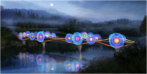 竹藝廊橋主體結構為三跨連續鋼箱梁橋。本方案以廣西毛南族花竹帽為原型,利用圓形和發散形的骨架,建成或大或小的草帽狀構筑物,點綴橋身,相映成趣。通過簡單優美的線條表現山水倒影,意象深遠。