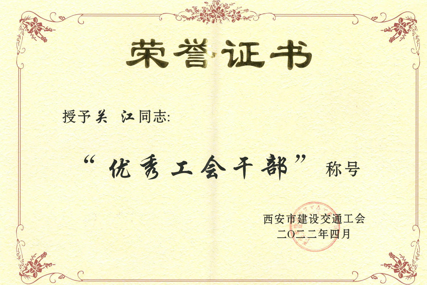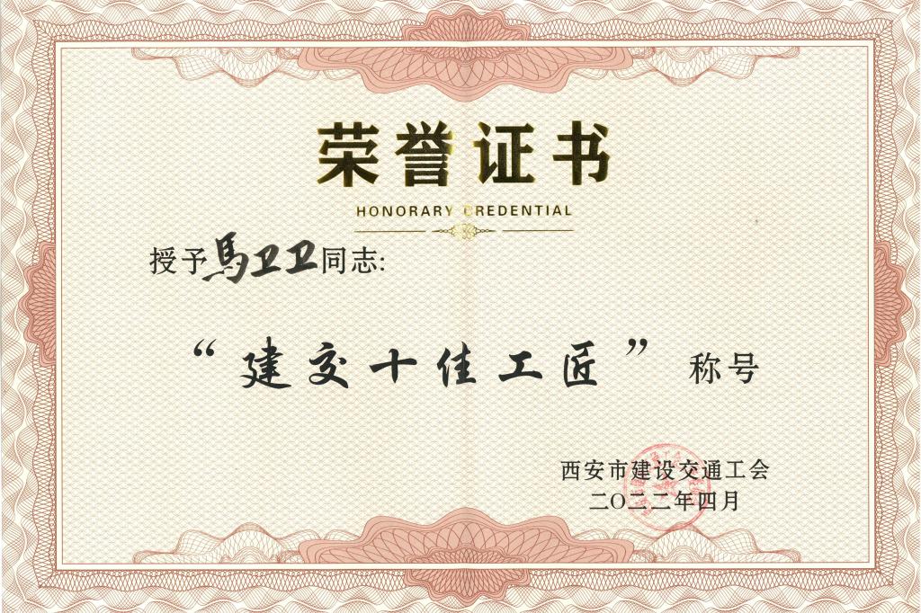 馬衛(wèi)衛(wèi)榮獲“2021年西安市重點(diǎn)工程立功競賽先進(jìn)個人”及西安市建設(shè)交通工會“十佳工匠”榮譽(yù)稱號;