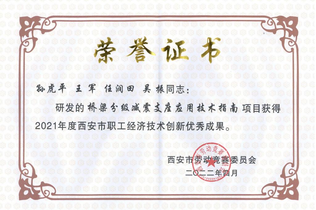 《橋梁分級減震支座應(yīng)用技術(shù)指南》榮獲“2021年西安市職工經(jīng)濟(jì)技術(shù)創(chuàng)新優(yōu)秀成果”;