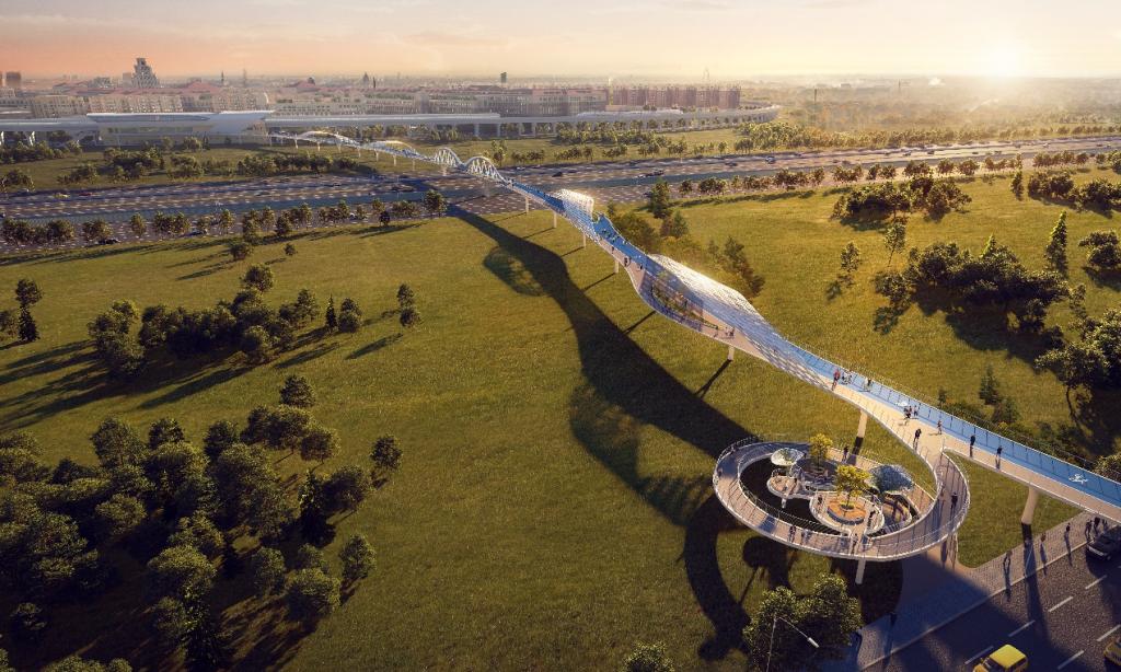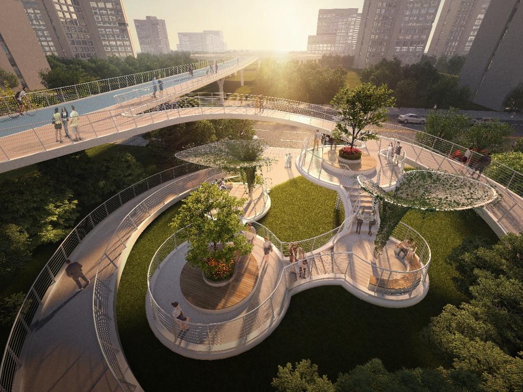 西安交通大學創新港人行天橋主橋設計創意來源于對交通大學百年發展史精神內涵的高度概括——“教書育人”,提取交大標志性建筑“飲水思源碑”中“書”的元素,通過舒緩的線條勾勒出“書”的造型,寓意交大莘莘學子筑夢新港、振翅高飛的美好愿景。橋梁采用曲線上加勁弦連續鋼箱梁的創新結構形式,由圓環形光影坡道圍成生態花園,既體現了交大“世界之光”的辦學理念,也是師生們休憩的理想場所,高低錯落的平臺采用梯道串聯,打造出立體多維、光影交互的景觀層次。橋下進行了精細化設計,將休憩、運動、生態、自然和諧融入整個設計之中,兼顧各層次和年齡段人群的休閑娛樂需求。